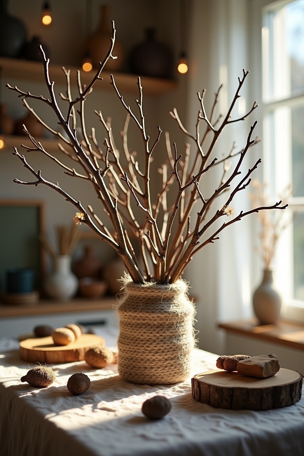 10. Jahreszeitliche Dekoration mit an Ästen befestigten Naturmaterialien