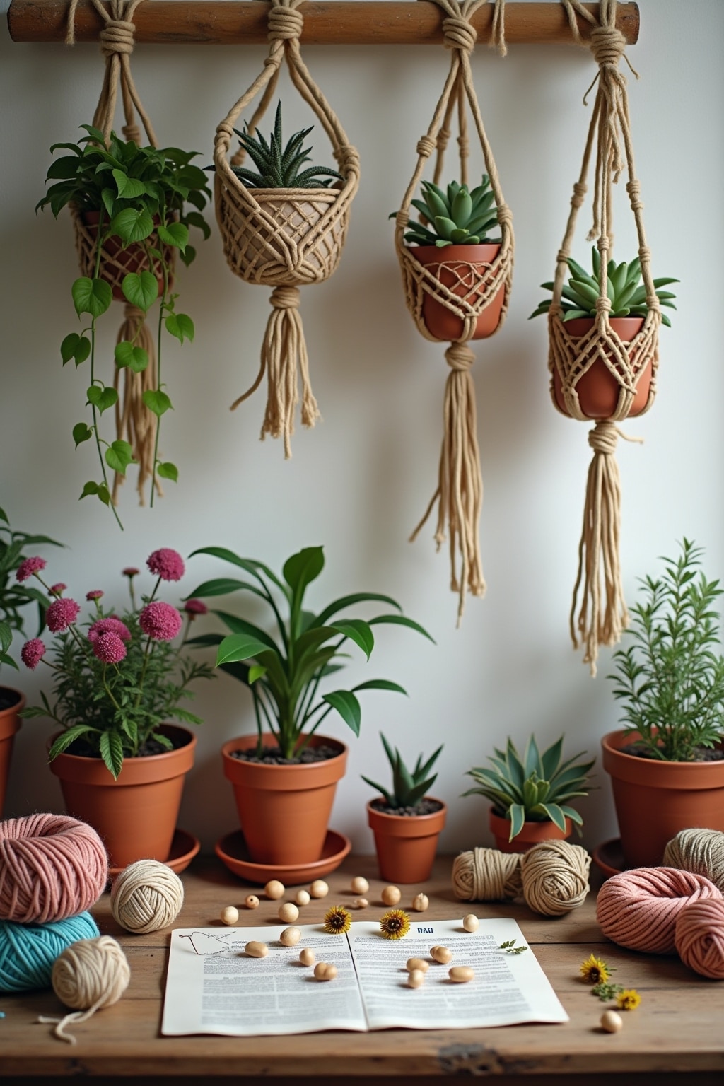 1. Macramé wall hangings using recycled cotton rope and driftwood