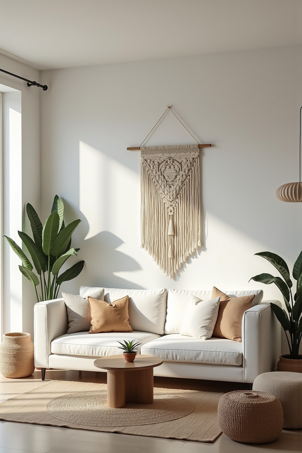 • Macramé wall hangings mixed with sleek framed art prints