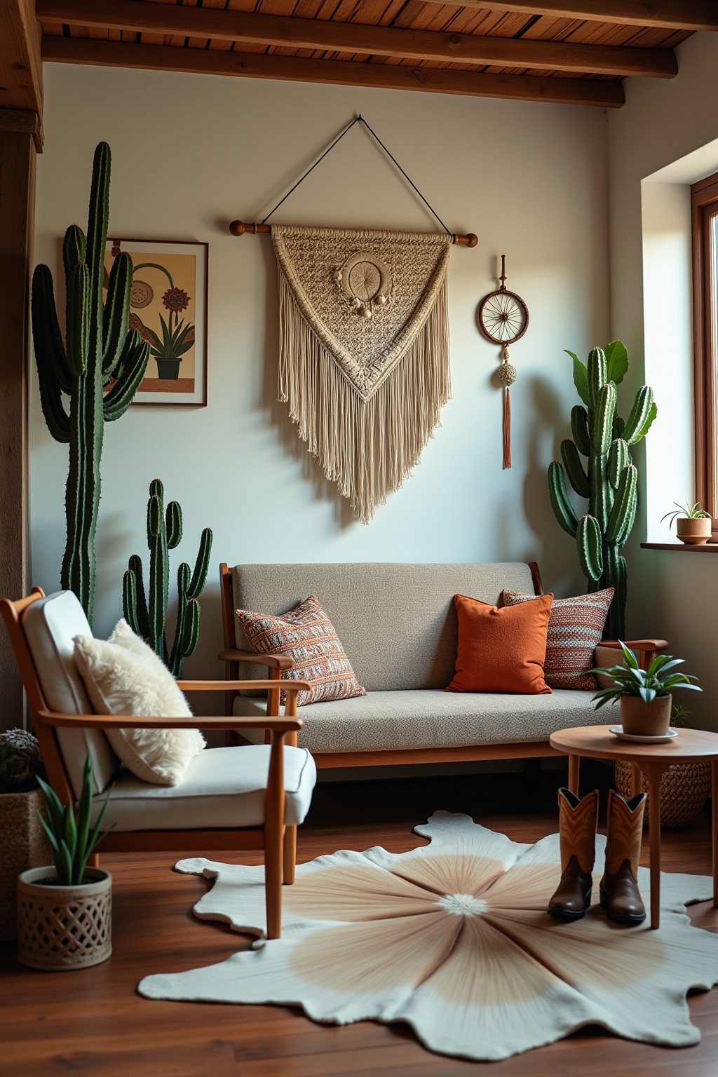 The bohemian western aesthetic celebrates freedom and adventure while honoring the rugged charm of the American frontier. Natural materials form the foundation of this style, with raw wood furnishings, leather accents, and stone elements creating an authentic, earthy atmosphere. Textiles play a crucial role in bohemian western spaces, incorporating Navajo-inspired patterns, serapes, and handwoven tapestries that add warmth and cultural richness. A thoughtfully curated color palette blends earthy neutrals with pops of sunset-inspired hues like terracotta, turquoise, and burnt orange to capture the spirit of desert landscapes. Vintage and handcrafted pieces tell stories of the past, whether through weathered cowboy boots repurposed as planters or antique ranch tools displayed as wall art. Plants are non-negotiable elements, with cacti, succulents, and dried wildflowers bringing the untamed beauty of western landscapes indoors. The most successful bohemian western interiors balance structured western elements with bohemian whimsy, creating spaces that feel both grounded and free-spirited.