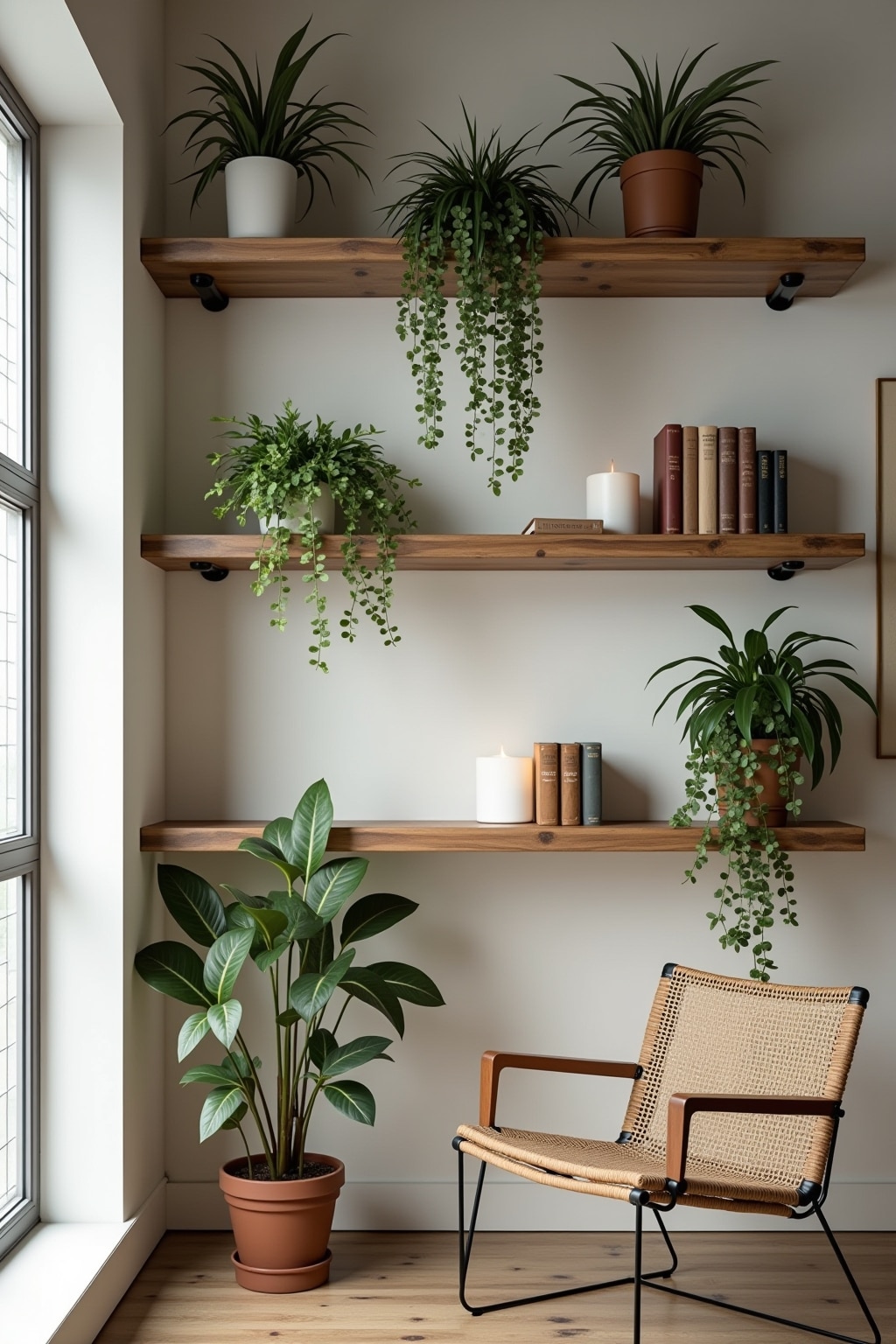 1. Reclaimed wood floating shelves with live edges for a rustic, organic feel