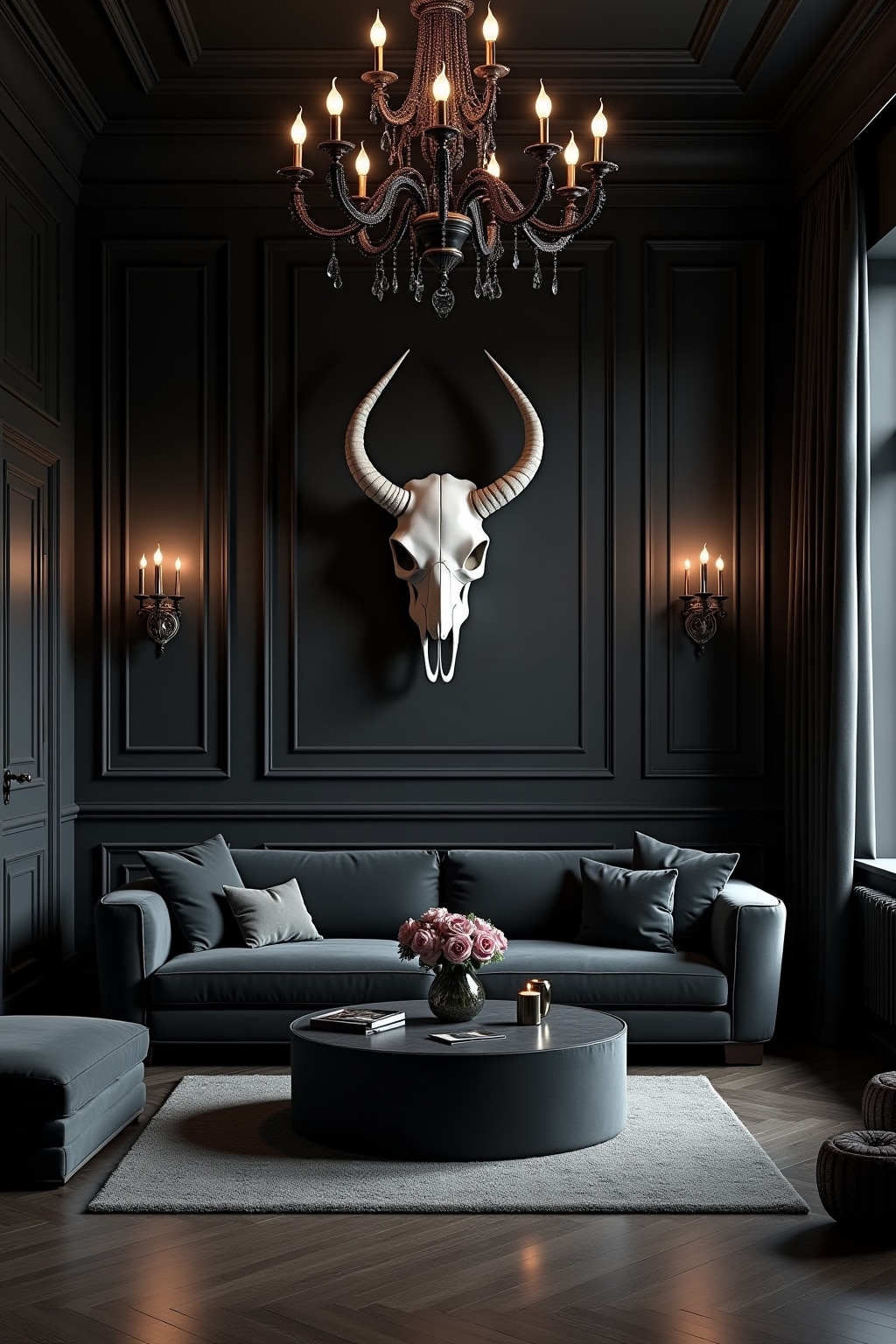 2. Install dramatic black ceiling medallions with crystal chandeliers for gothic glamour