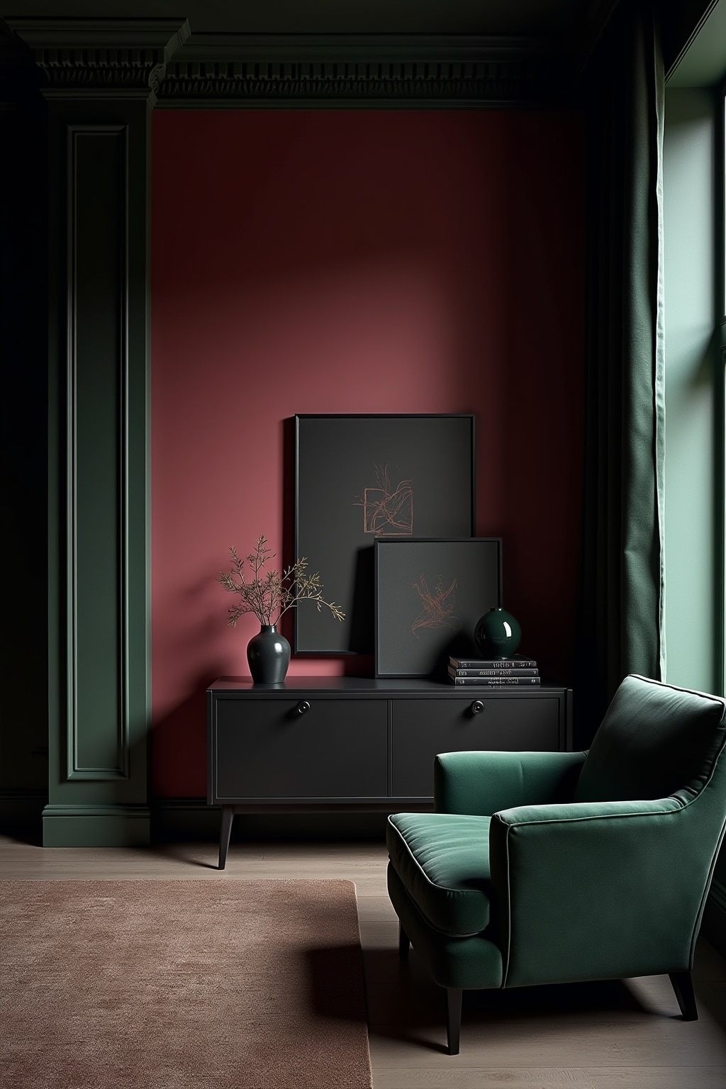 5. Paint trim and architectural details in high-gloss black against matte walls