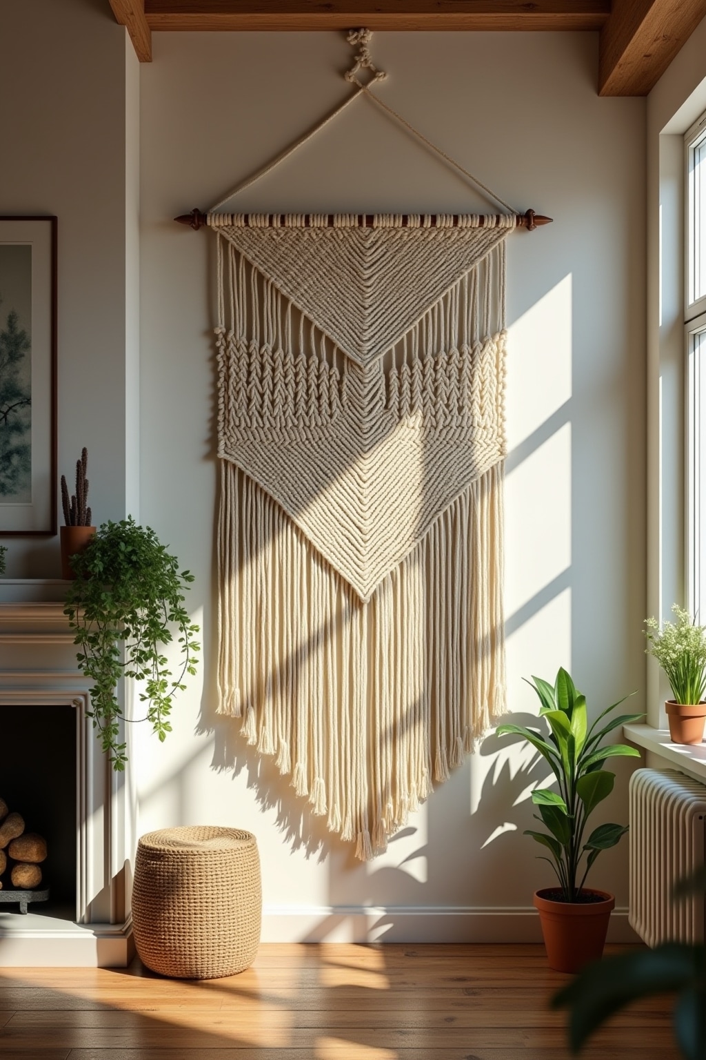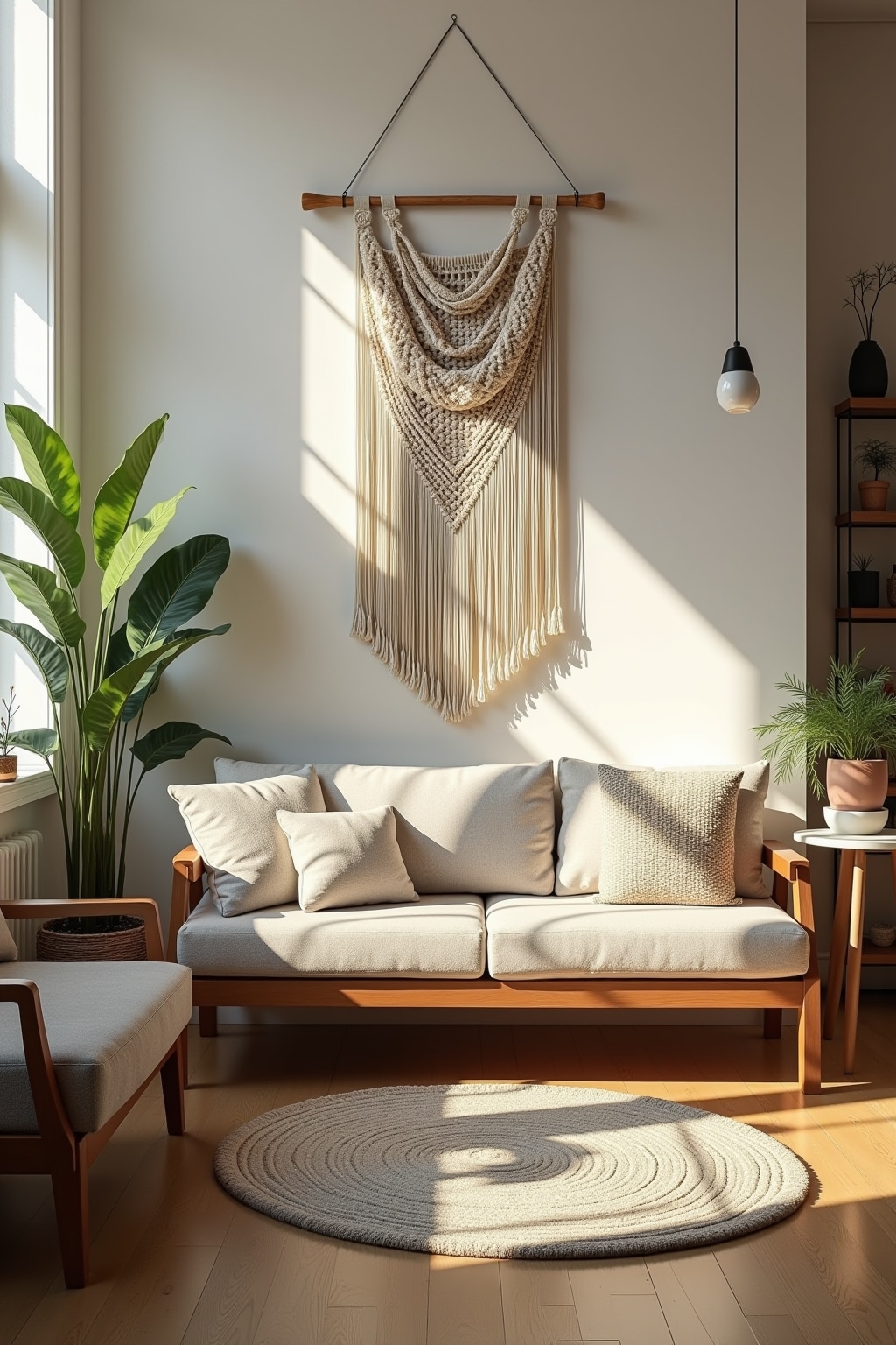1. Living Room: Layer a large macrame wall hanging above your sofa as a focal point and complement with smaller matching pieces like plant hangers or cushion covers