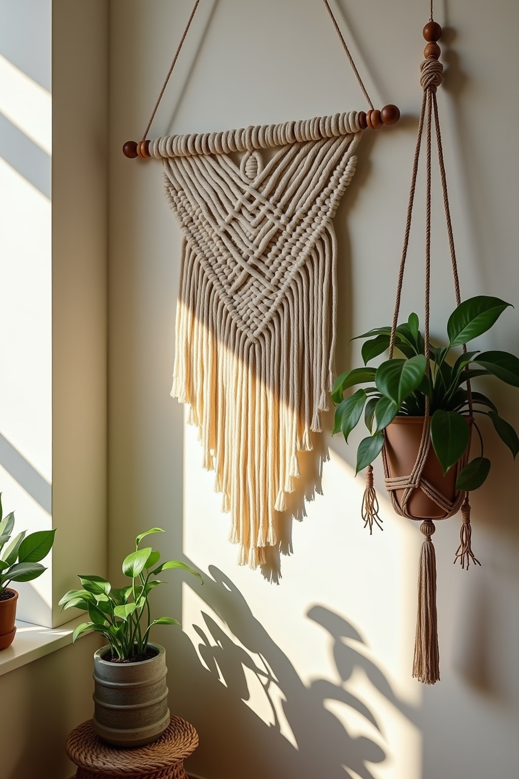 8. Integrate plants by creating plant hangers that complement your wall pieces