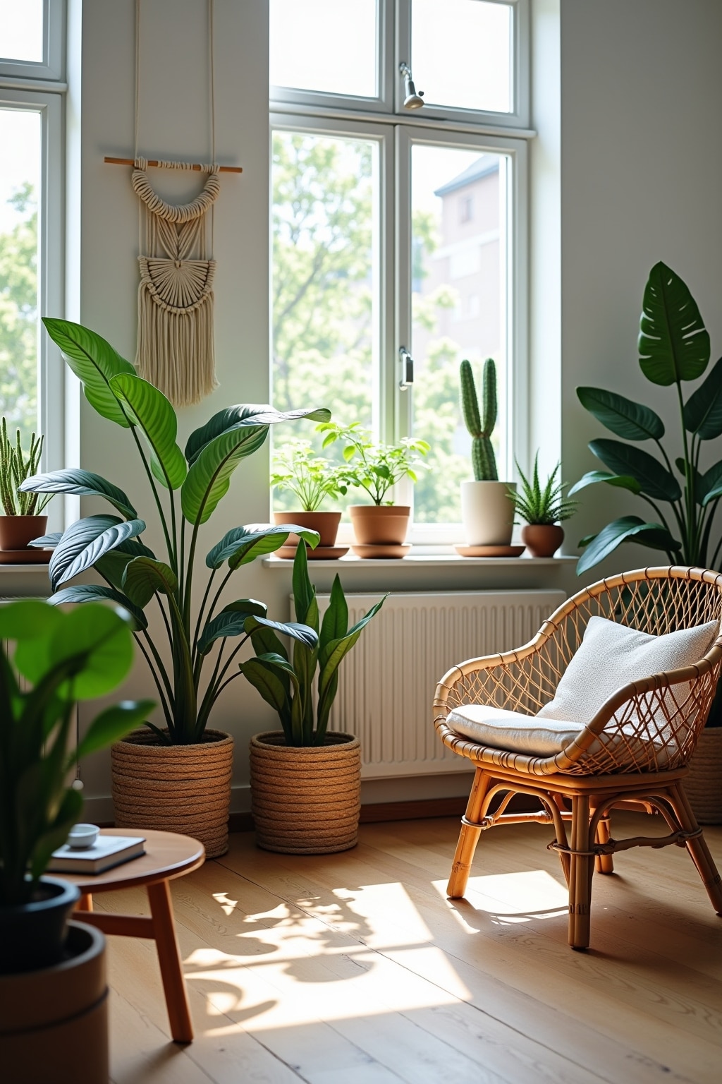 Scandinavian Bohemian design creates a captivating harmony between structured Nordic minimalism and the carefree bohemian aesthetic. Natural materials like light woods, rattan, and hemp serve as the foundation for this distinctive style, while layers of texture through handwoven textiles add warmth to the clean Scandinavian backdrop. Though the color palette remains predominantly neutral with whites, creams, and soft grays, subtle pops of muted earthy tones like terracotta, sage green, and dusty blue bring bohemian vibrancy without overwhelming the space. The furniture maintains the classic Scandinavian silhouettes—clean-lined and functional—but gets softened with organic elements like curved rattan pieces, macramé wall hangings, and loose linen upholstery that embody the free-spirited bohemian influence. Plants become essential design elements, with sprawling monstera leaves, trailing pothos vines, and sculptural cacti adding life and a connection to nature that both design philosophies deeply value. Personal touches through artisanal crafts, travel souvenirs, and handmade pottery tell stories while maintaining the intentional, uncluttered environment that makes this fusion so appealing. This balanced approach creates spaces that feel simultaneously serene and soulful—practical enough for everyday living yet filled with personality and warmth.