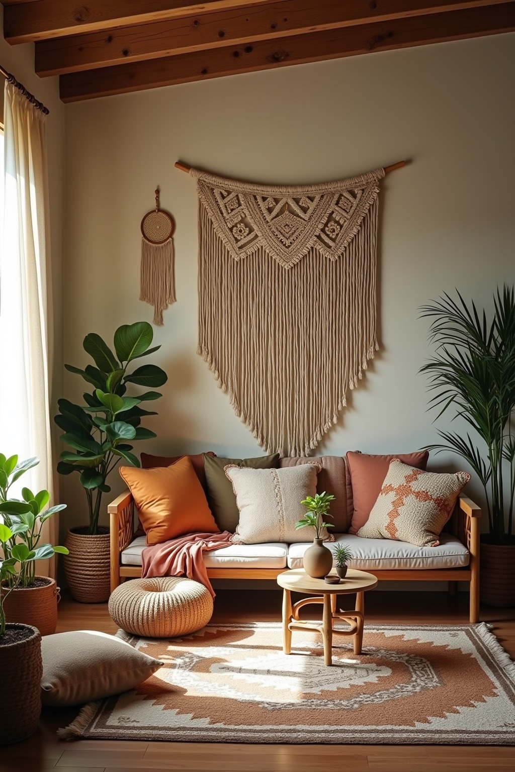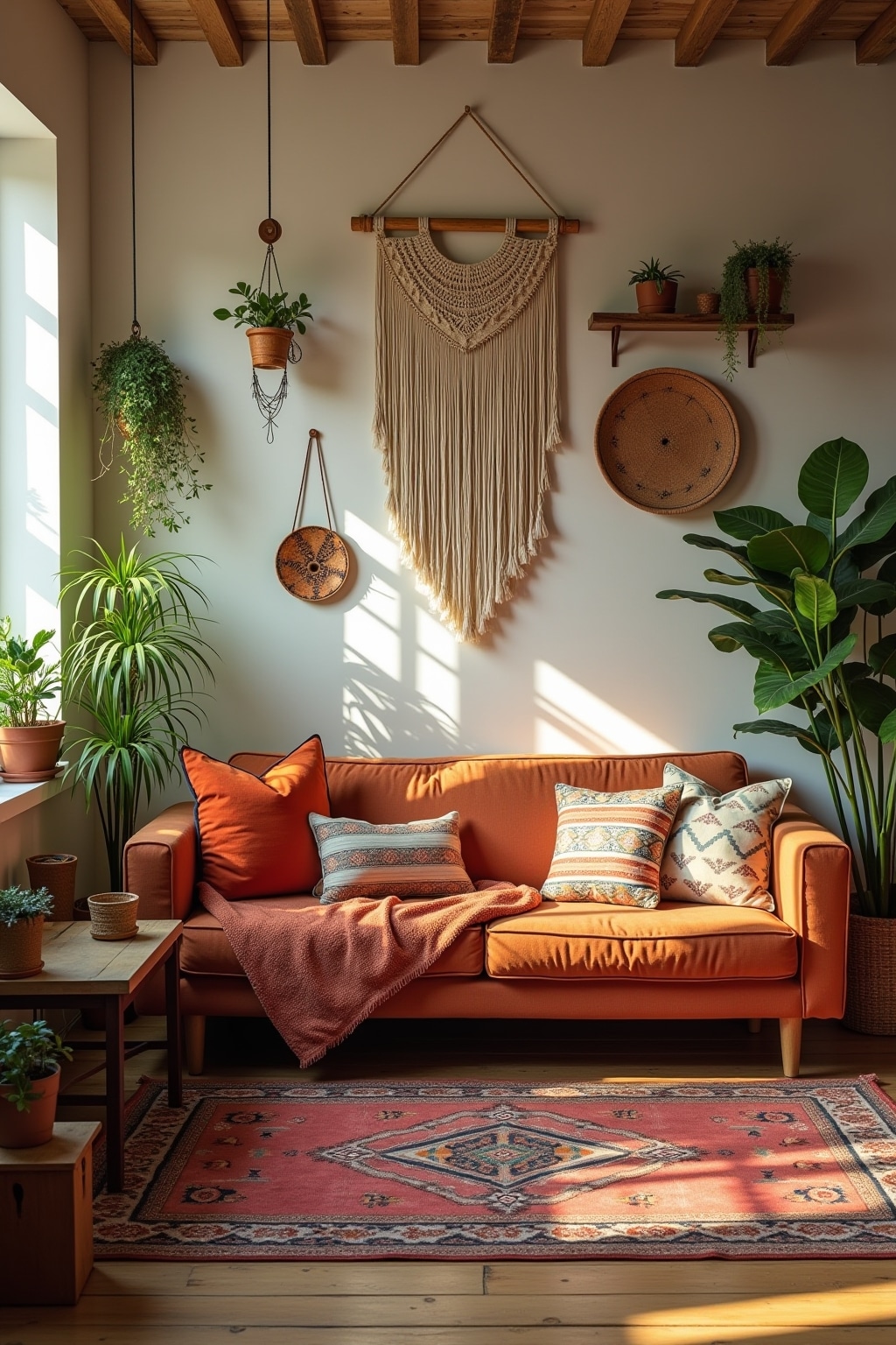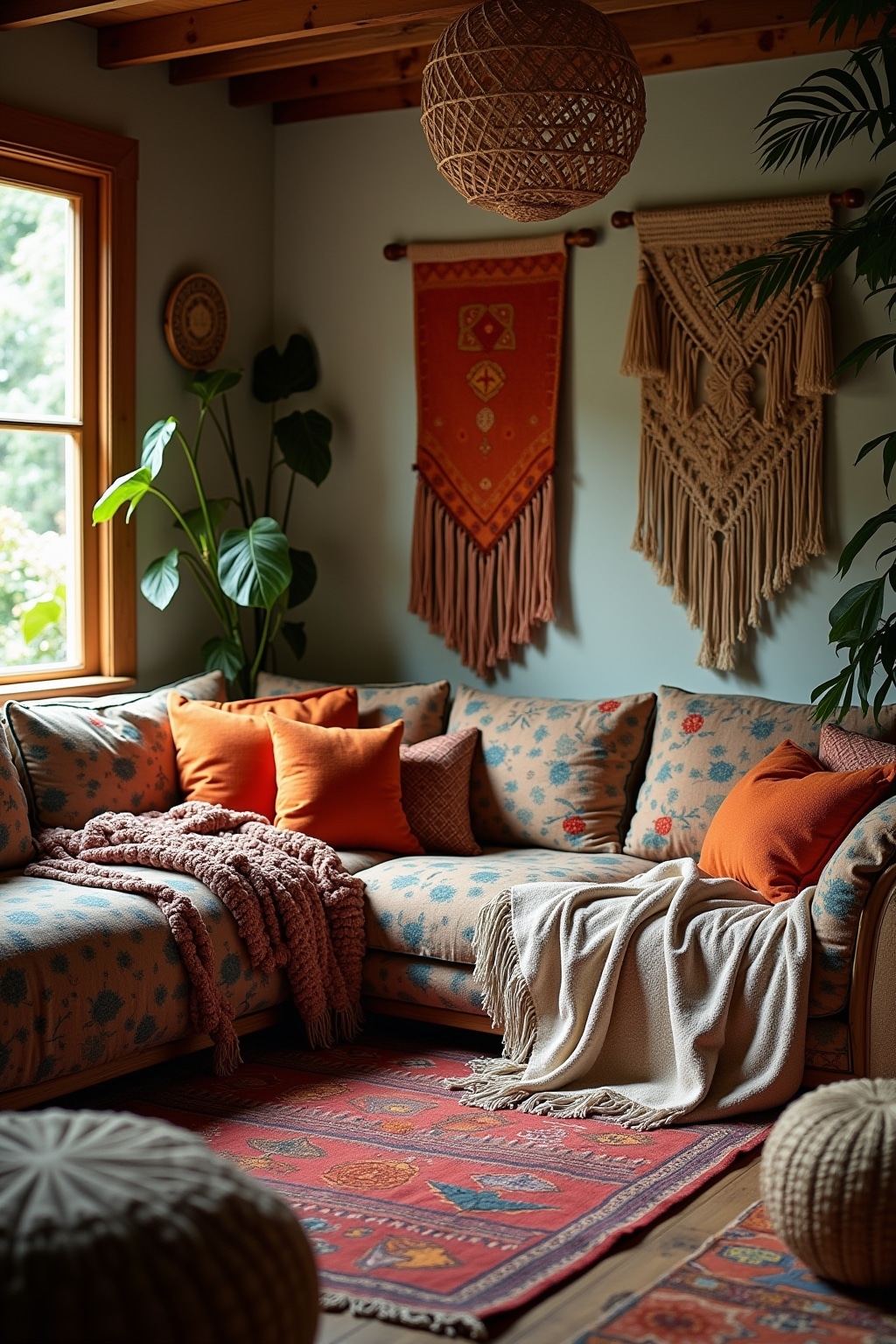 1. Layered textiles including Moroccan rugs, macramé wall hangings, and embroidered pillows