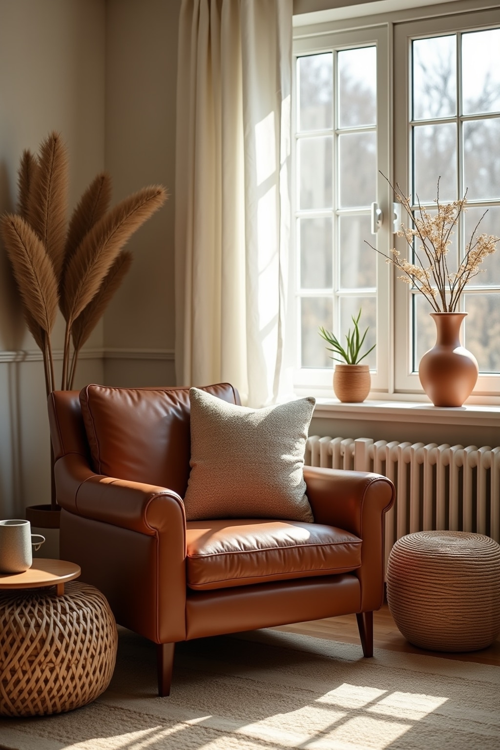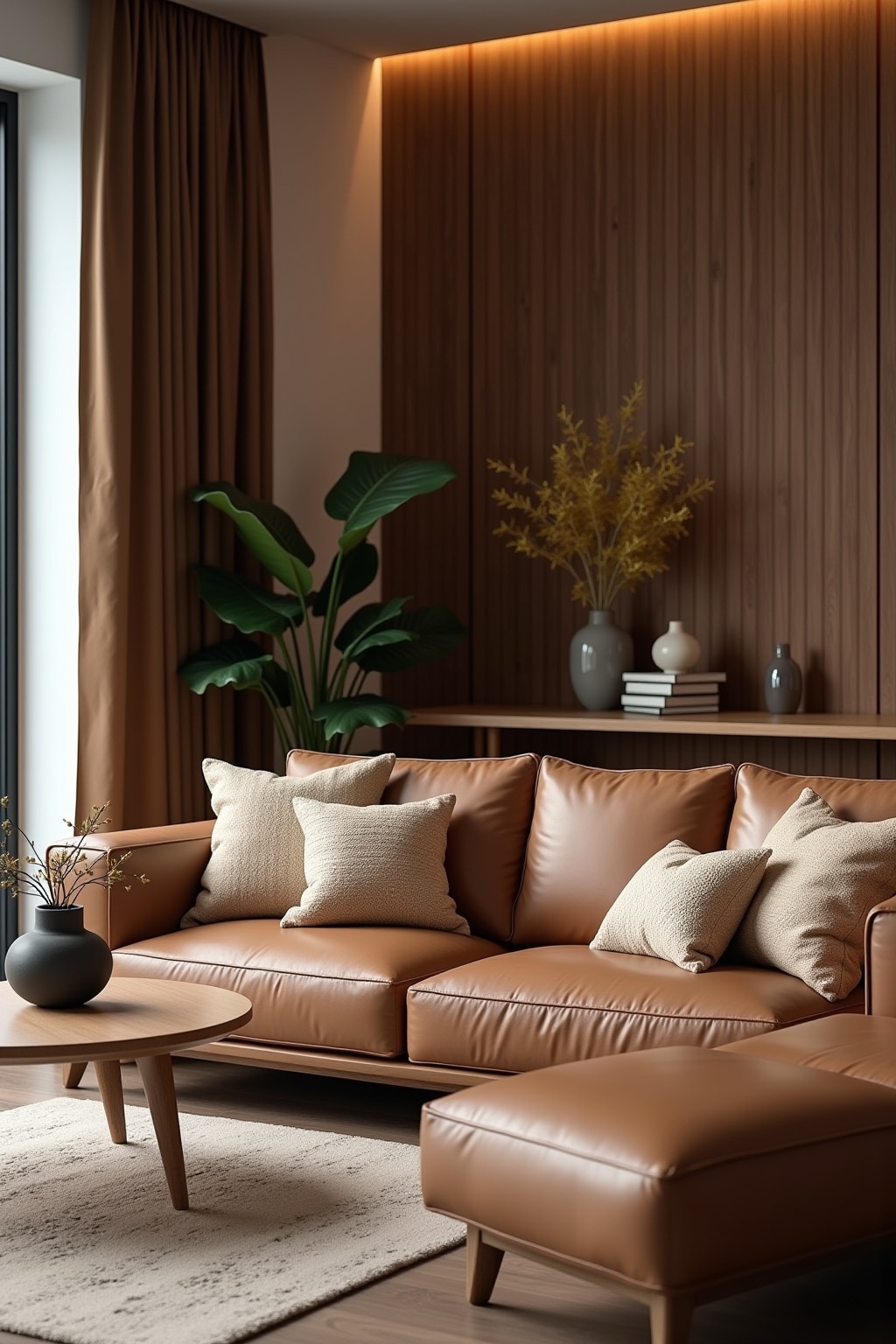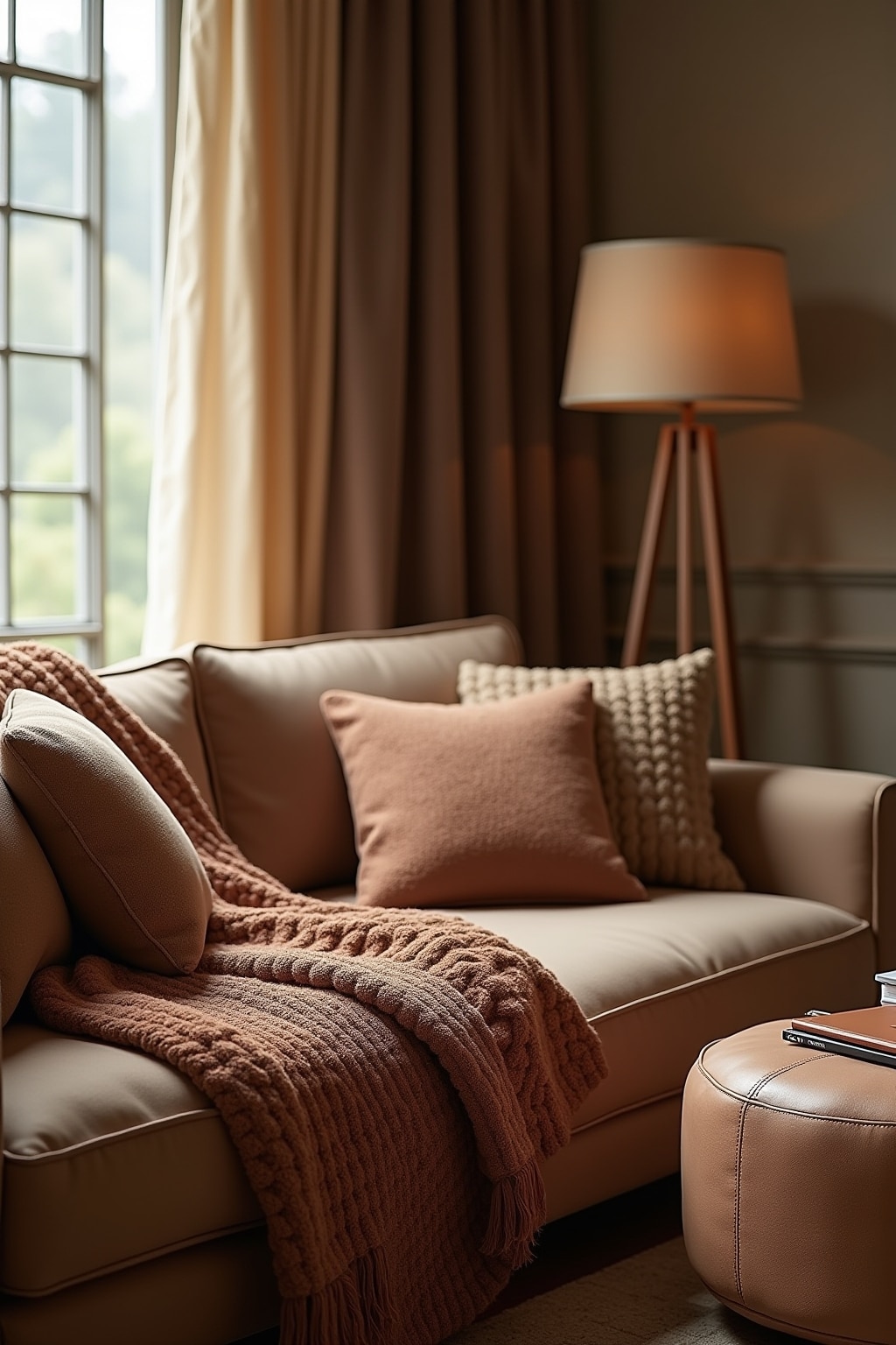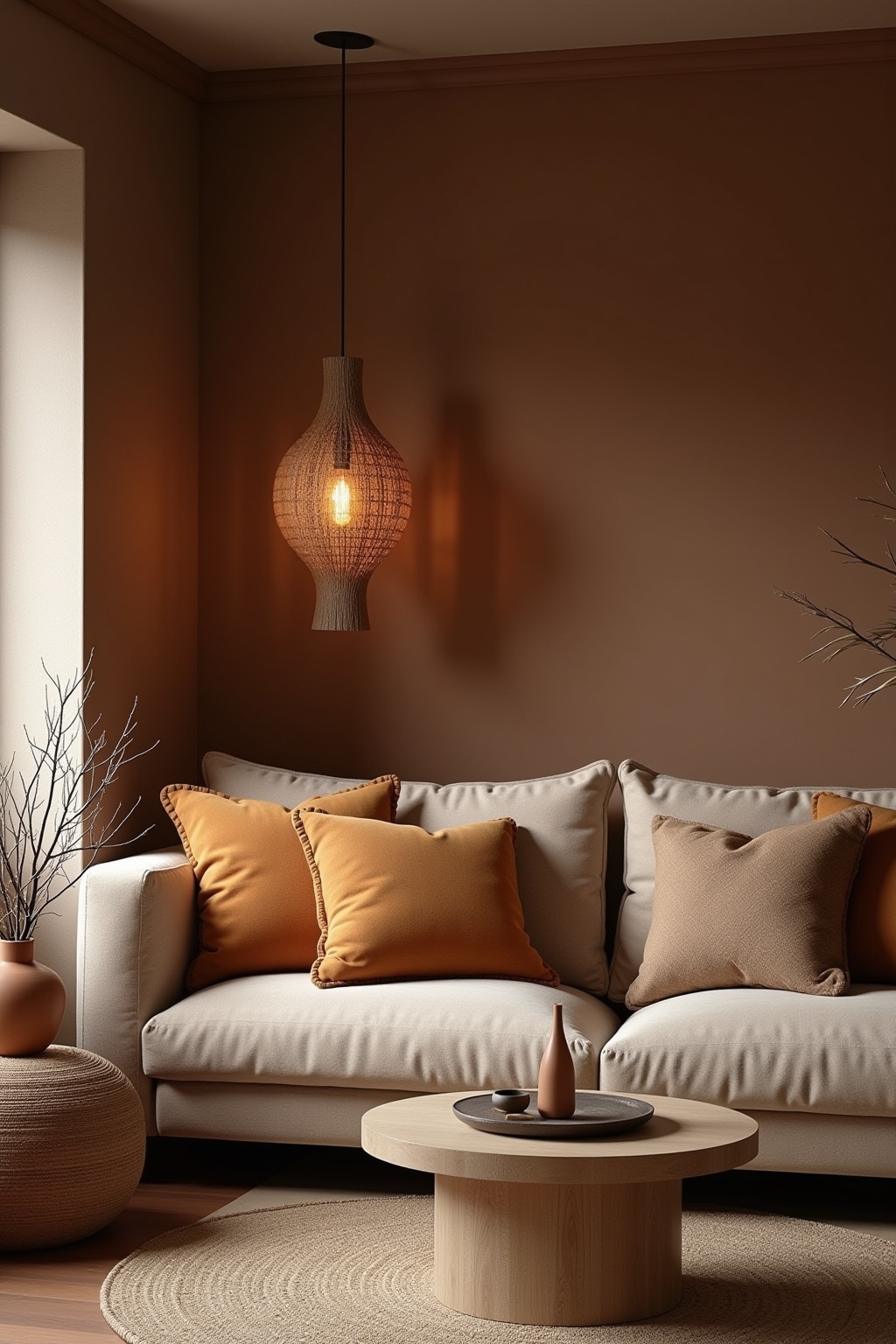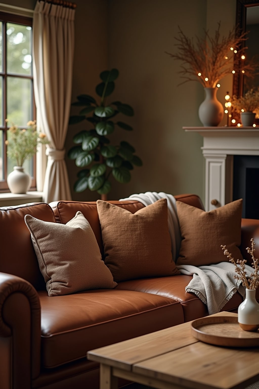 2. Layer various brown textiles like linen curtains, woolen throws, and leather pillows for tactile richness.
