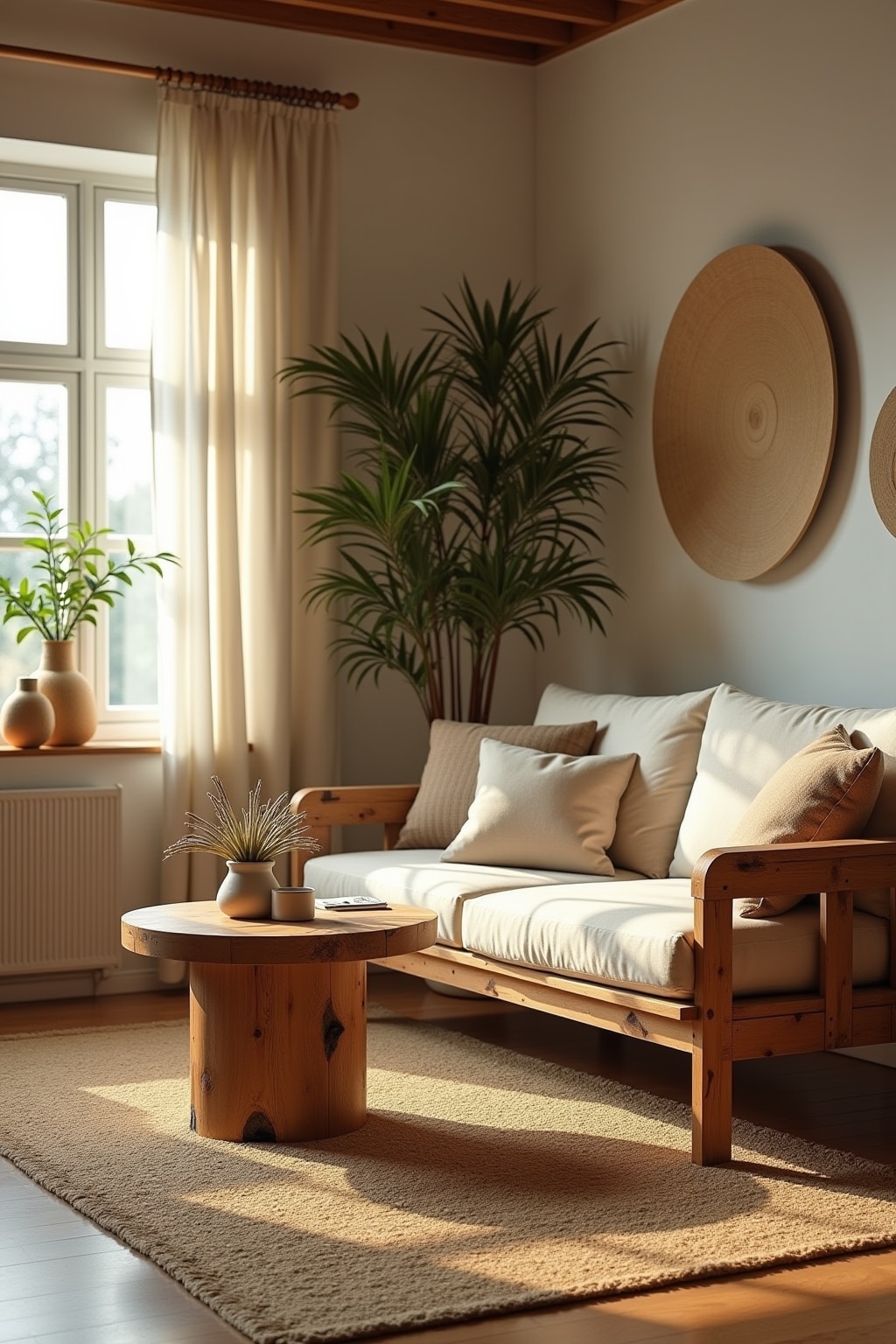 • Add linen curtains alongside wooden furniture with visible grain