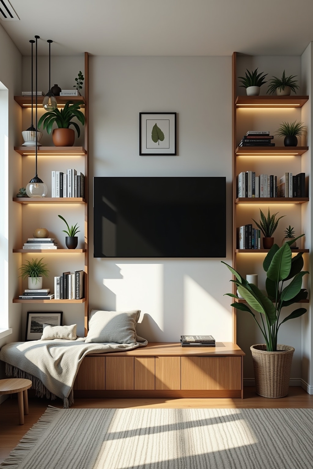 8. Place small accent lights on bookshelves to highlight decor and create depth
