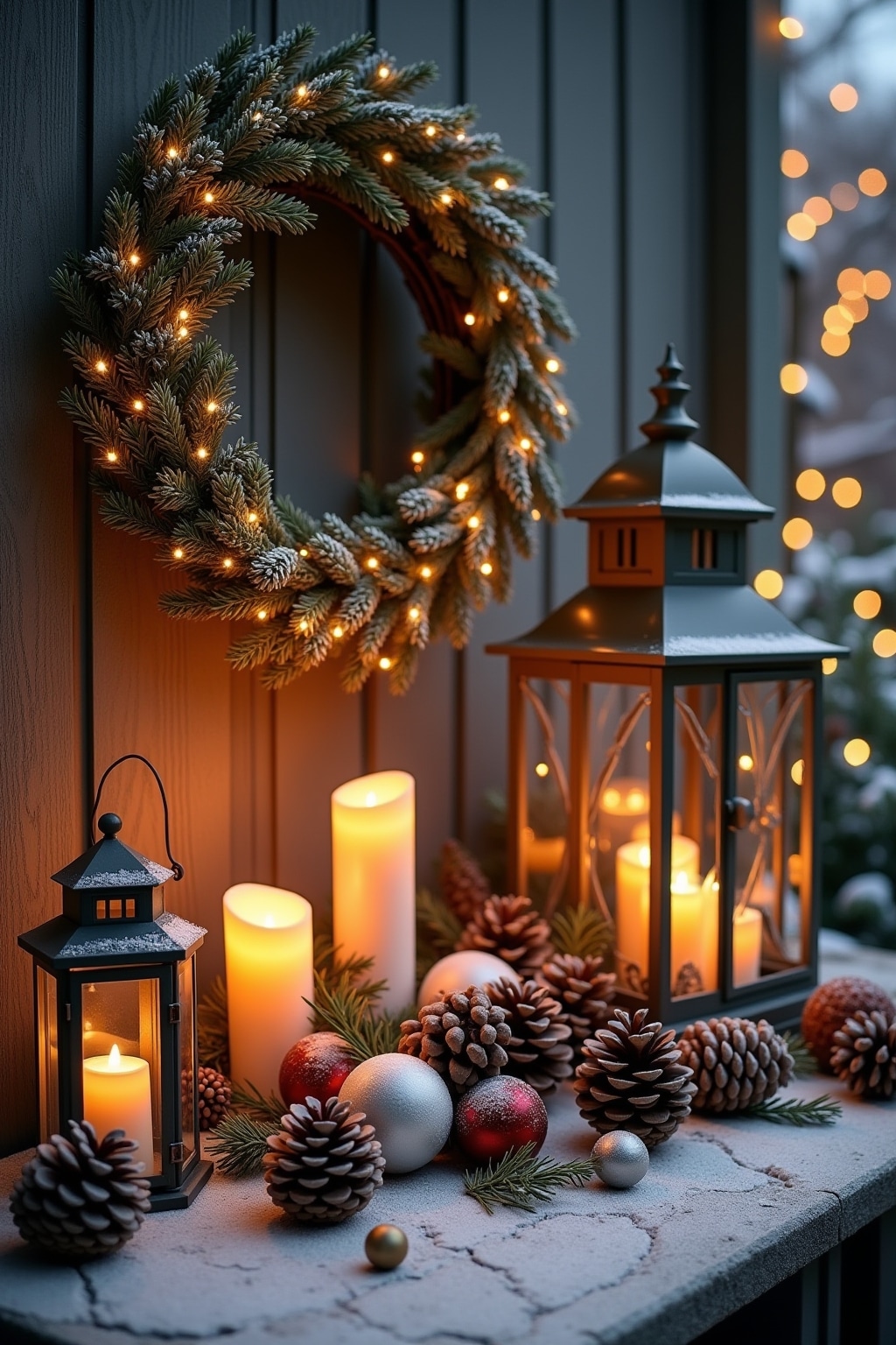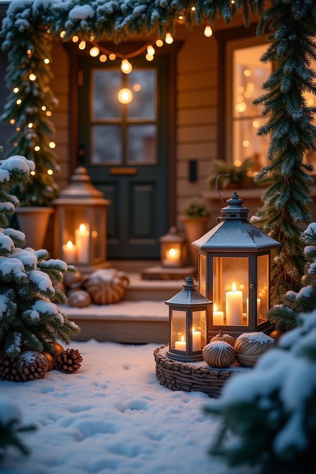 8. Festliche Terrassendekoration mit Wolldecken, Laternen und immergrünen Pflanzen