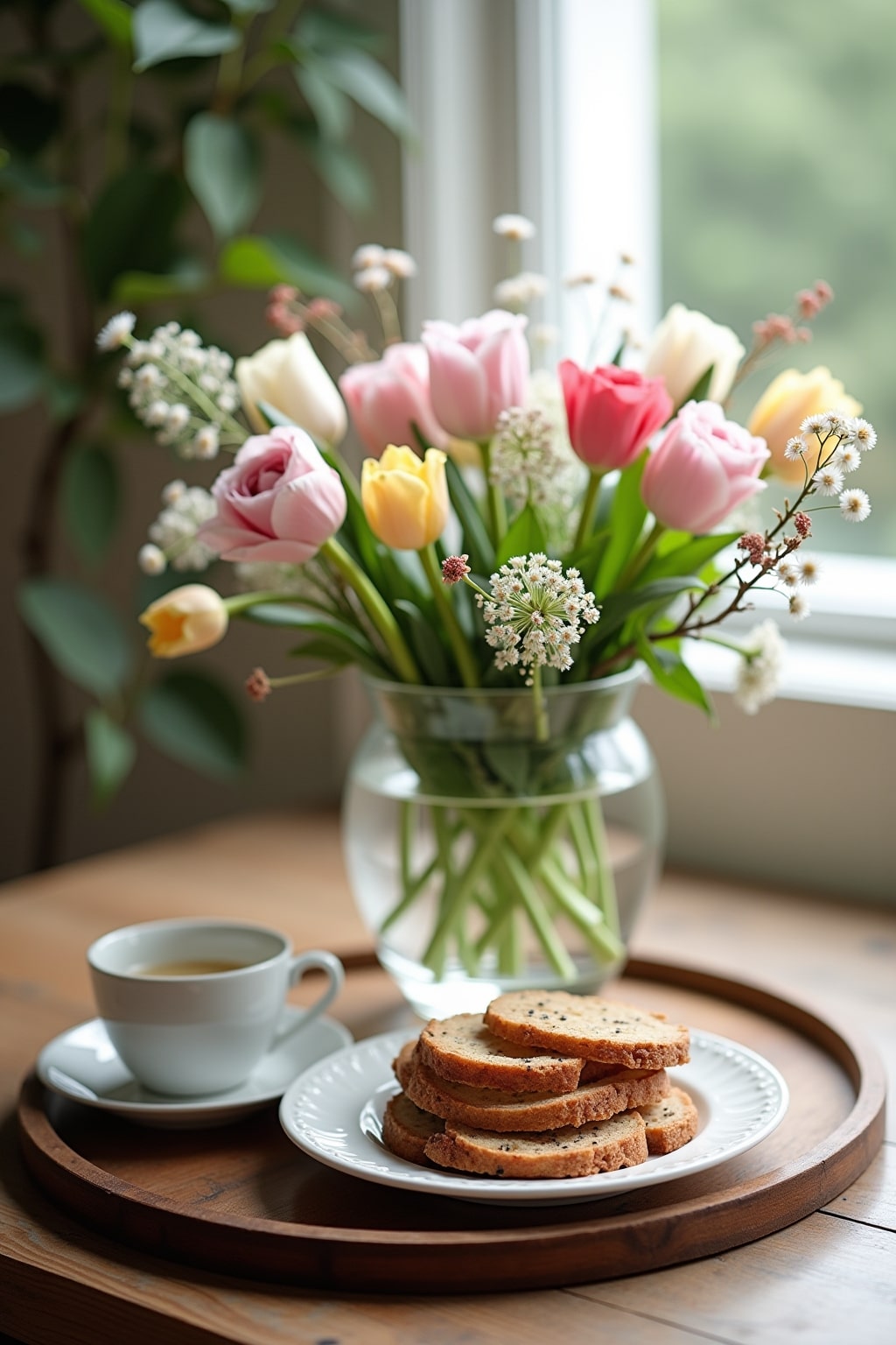 – Glasvase mit Tulpenbouquet auf rustikalem Holztablett