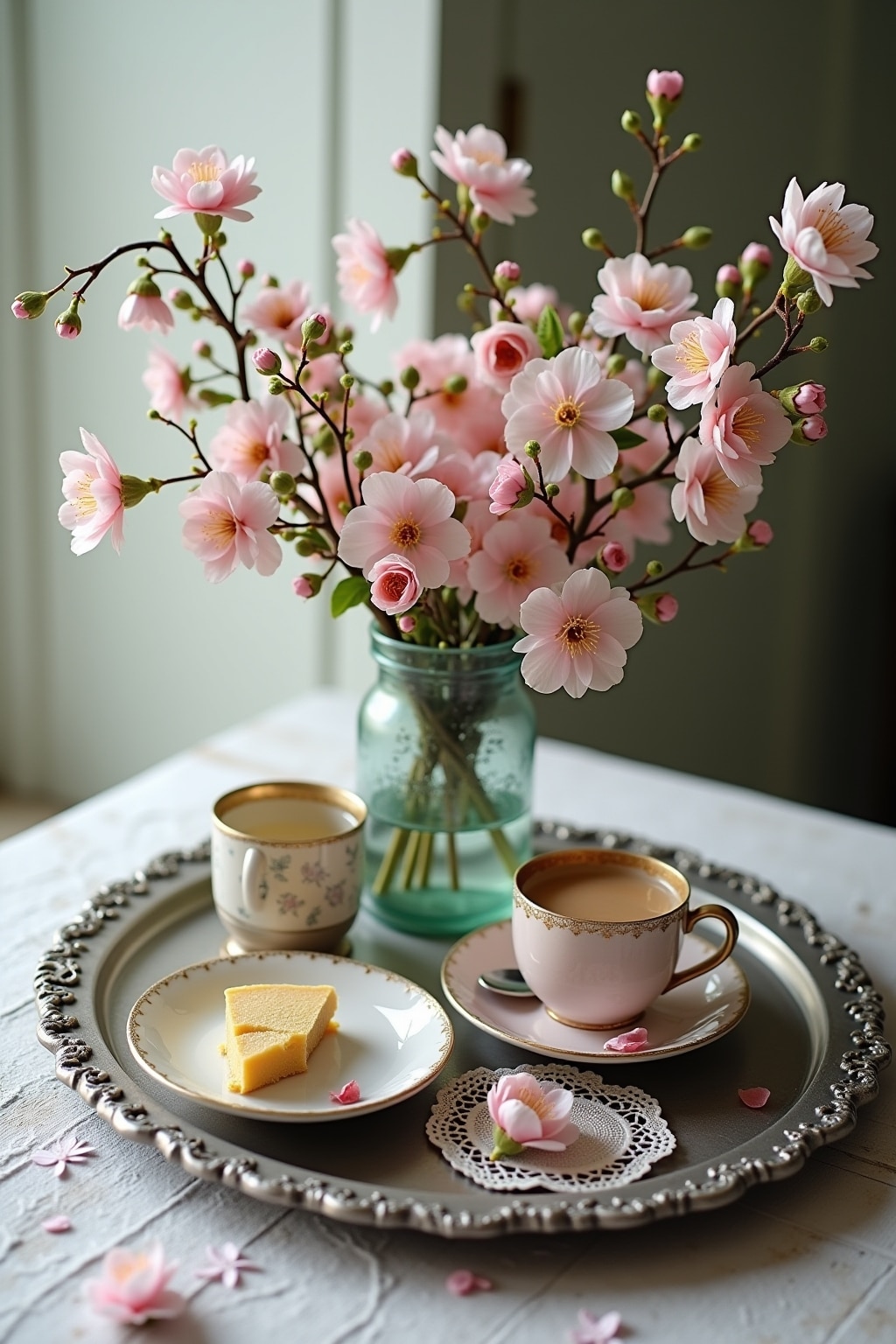 6. Pastel-Dessert-Display mit Macarons und Kirschblütenzweigen