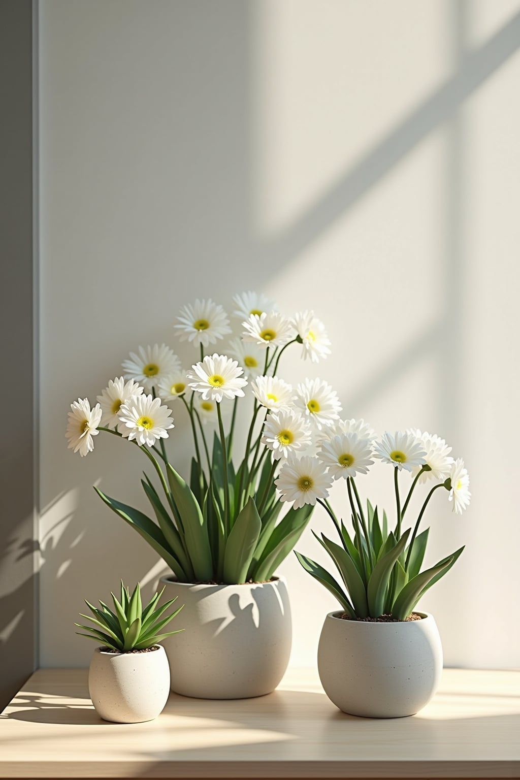 2. Minimalistisch: Einzelne weiße Primeln in schlichten Betontöpfen auf dunklen Holzoberflächen