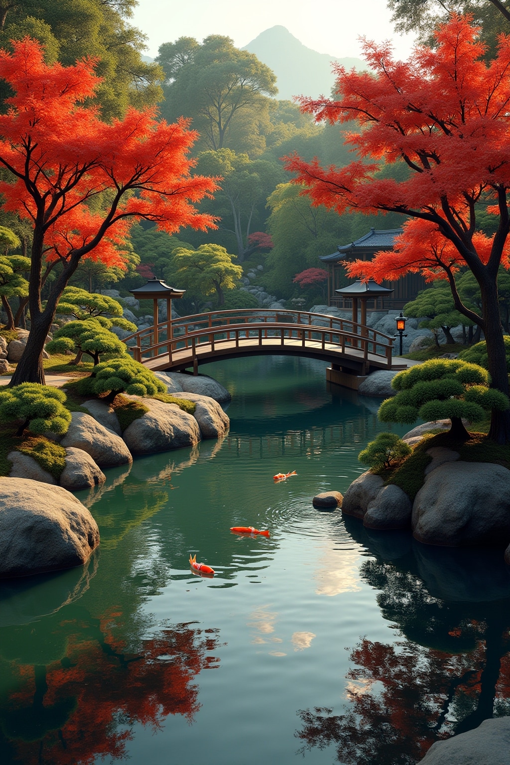 • Koi ponds where colorful fish glide beneath lily pads