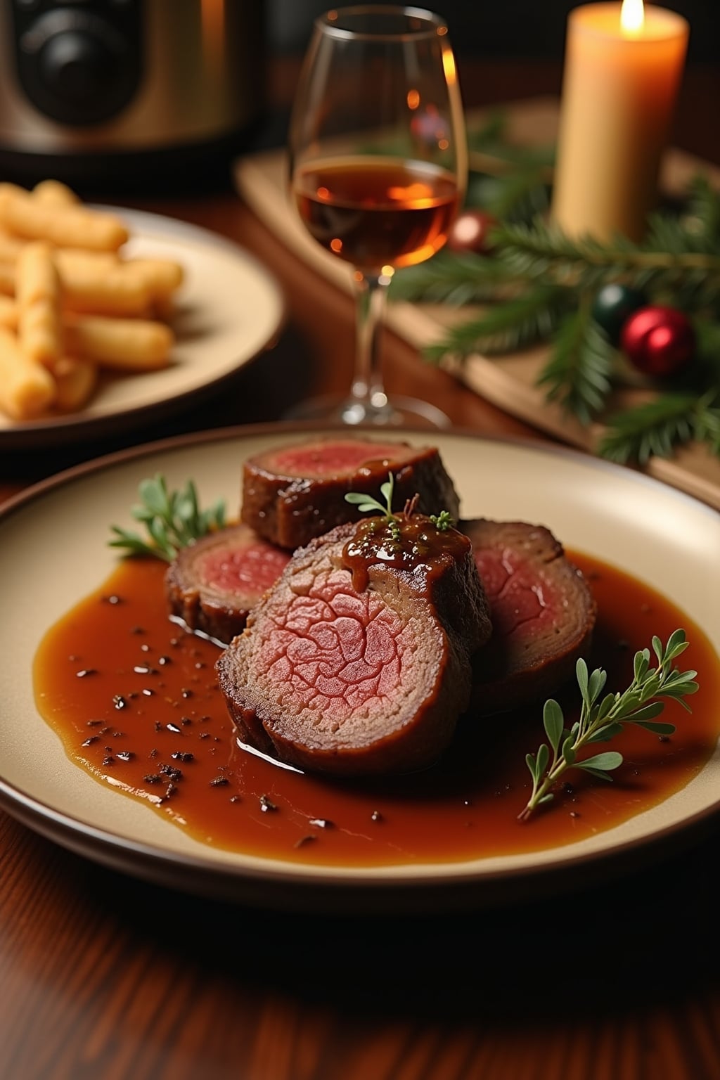 – Garnish with fresh thyme and a drizzle of reduced sauce