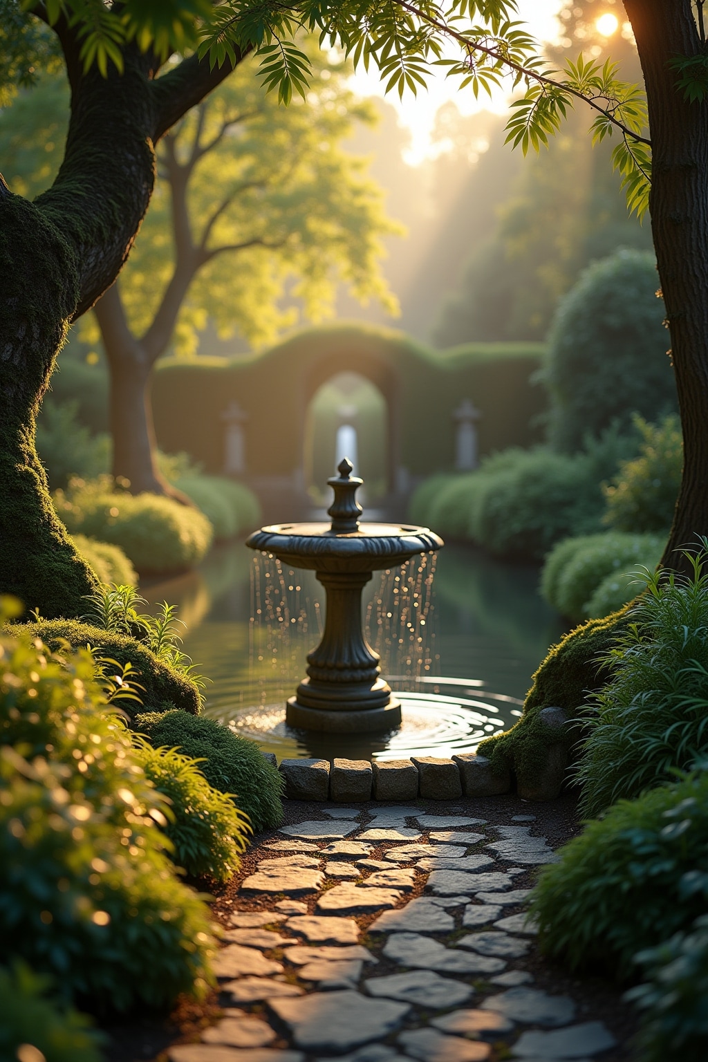 1. Natürliche Materialien wie Sandstein oder verwitterter Kalkstein für Brunnen und Einfassungen verwenden