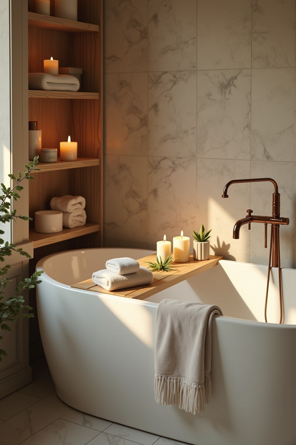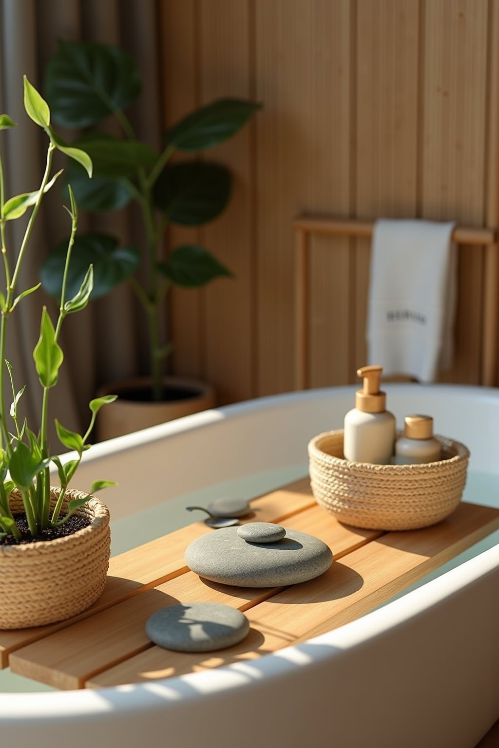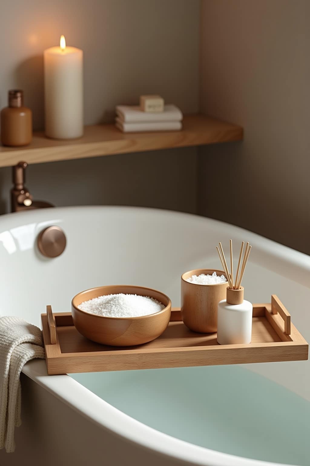 – Positioniere ein kleines Holztablett für Badezusätze und Pflegeprodukte griffbereit am Wannenrand