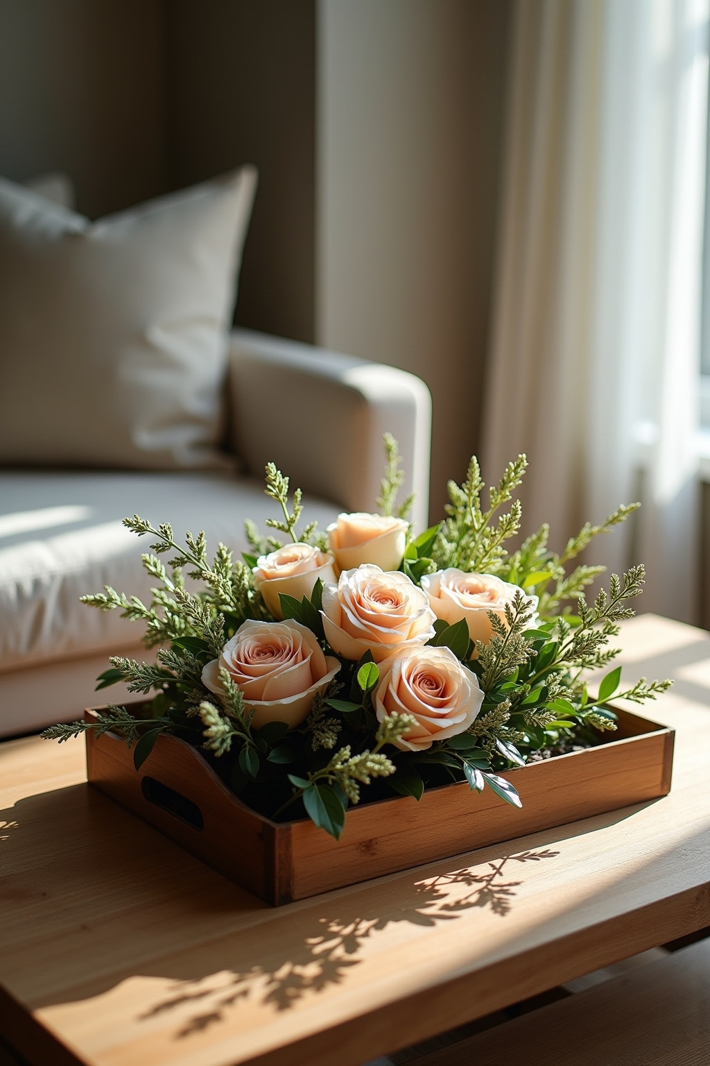 • Ein flaches Tablett mit erhöhtem Rand verwenden, um das Arrangement zusammenzuhalten