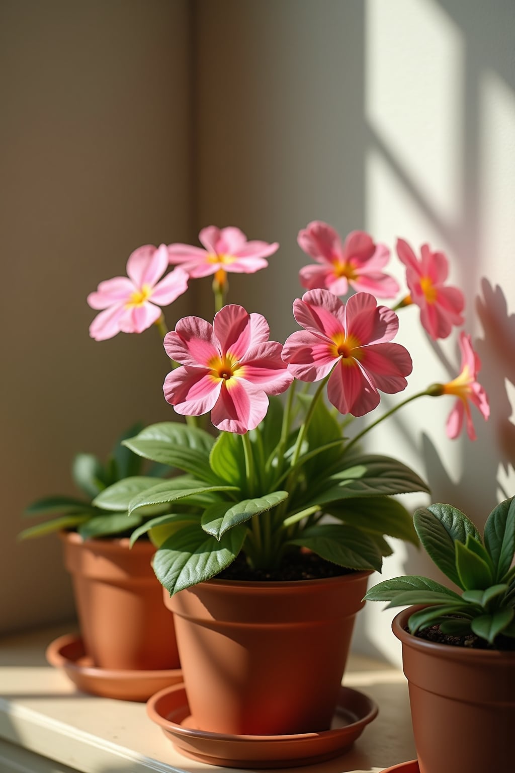 3. Mediterrane Fensterbankdeko mit Primeln in Terrakotta-Töpfen