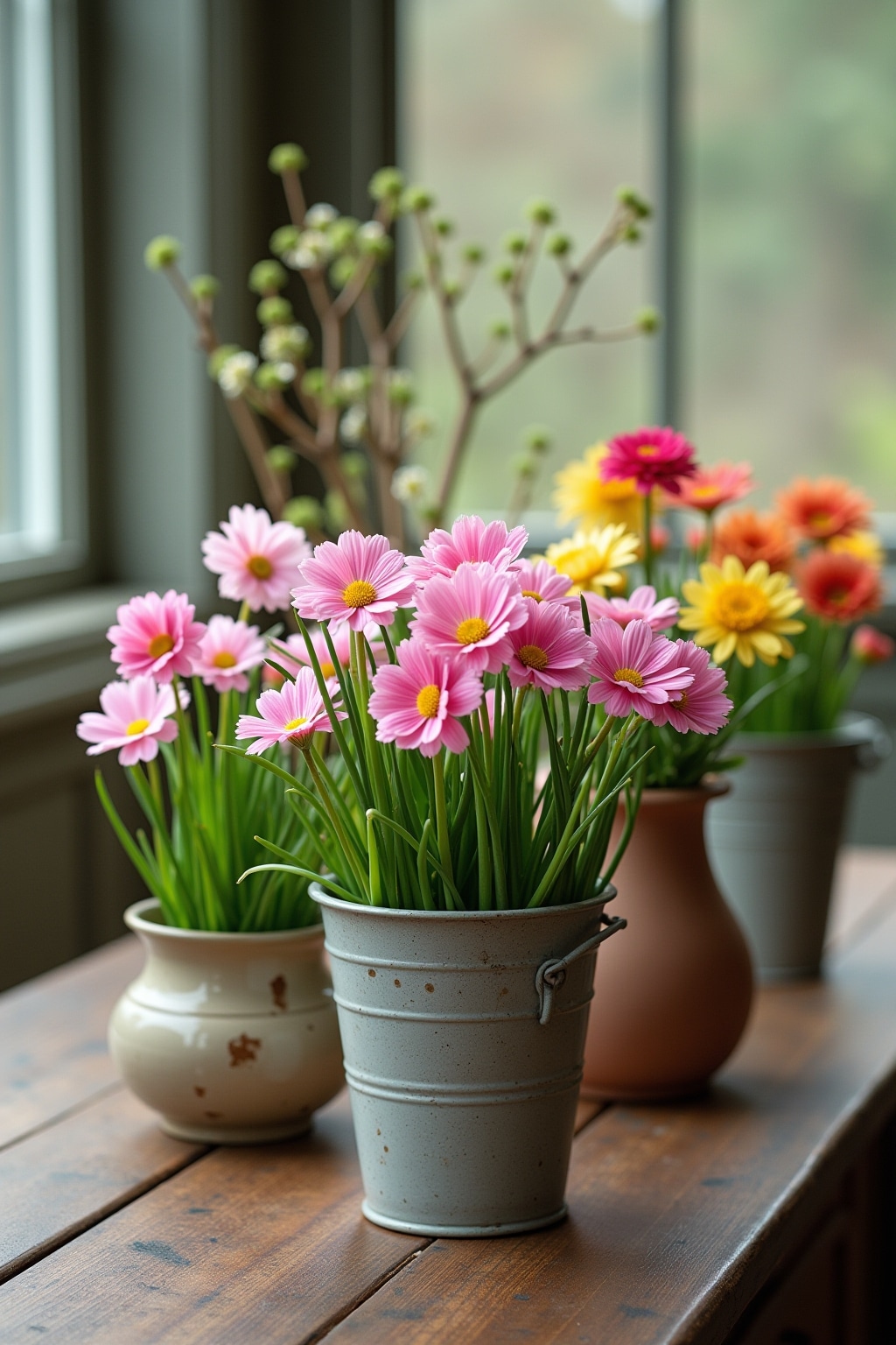 4. Industrial-Look mit Primeln in Konservendosen oder Metallbehältern
