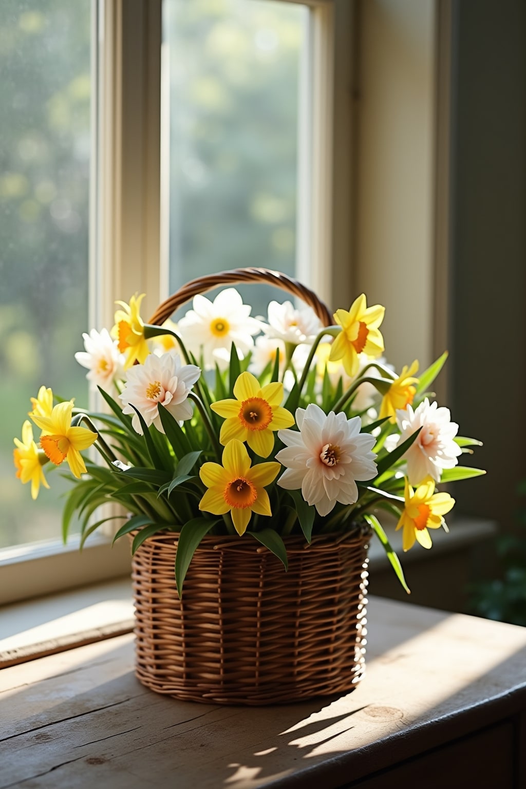 7. Primeln zusammen mit Frühlingsblühern wie Narzissen in Weidenkörben arrangieren