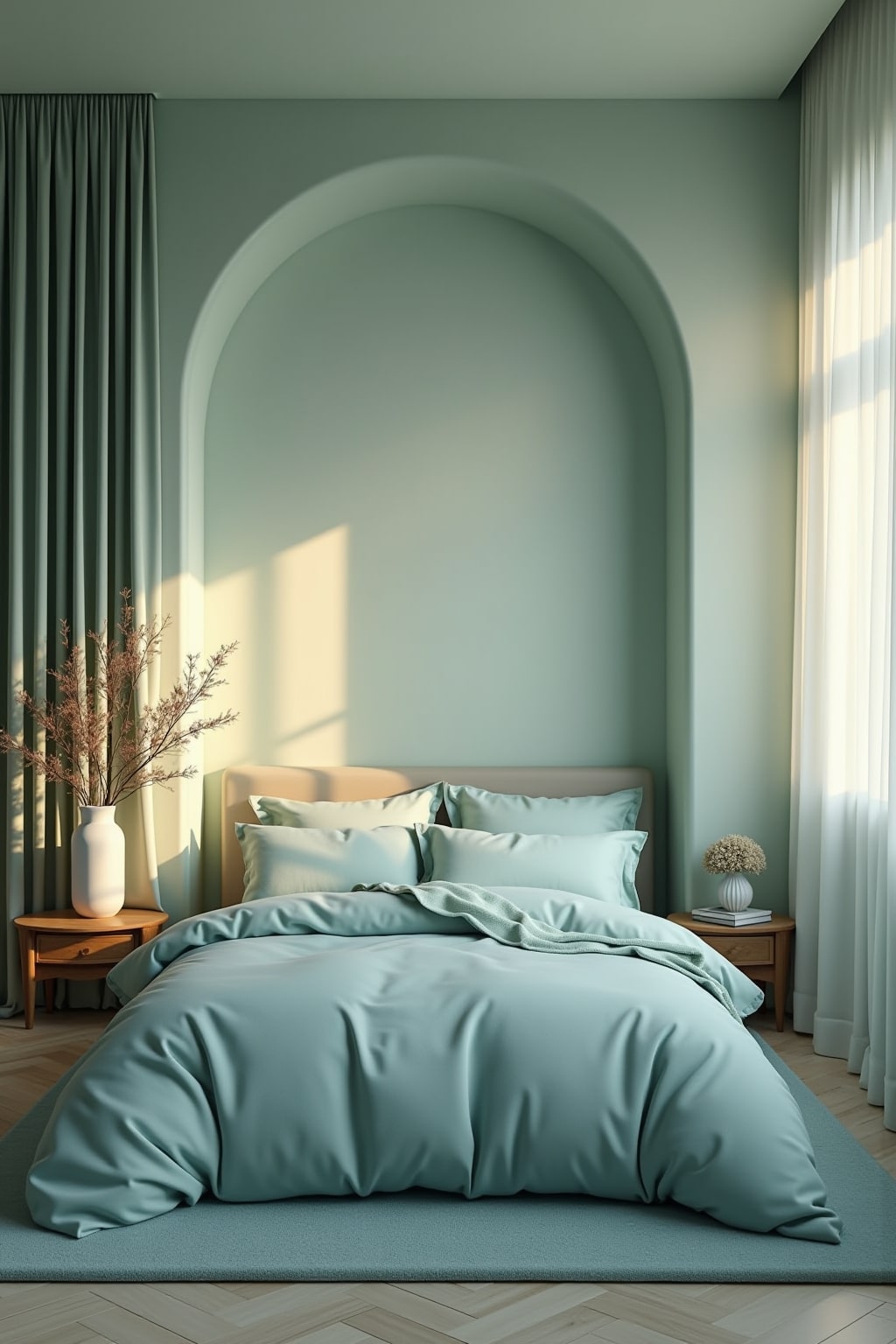 1. Farbige Akzentwand hinter dem Bett mit beruhigenden Blau- oder Grüntönen