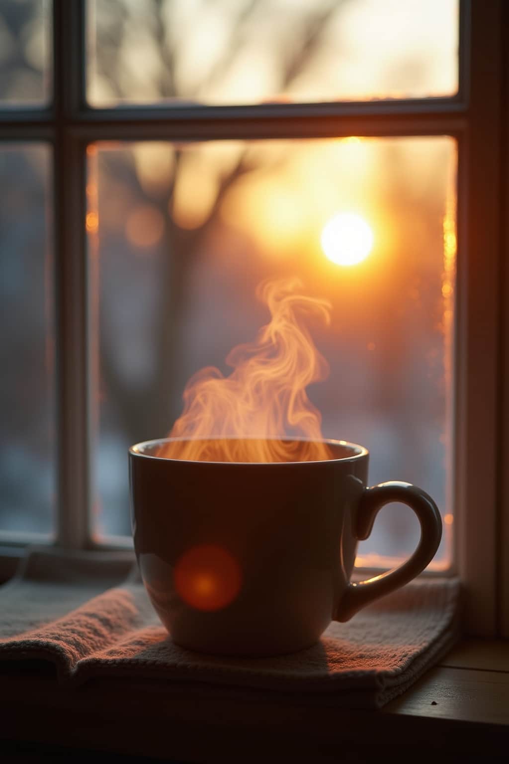4. Winter: „Einen gemütlichen guten Morgen! Während draußen die Schneeflocken fallen, wünsche ich dir Wärme und Behaglichkeit für deinen Tag.“