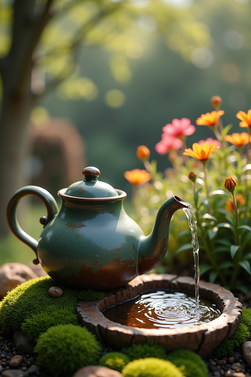 10. Moosbewachsener Teekannen-Brunnen für naturnahen Gartenstil