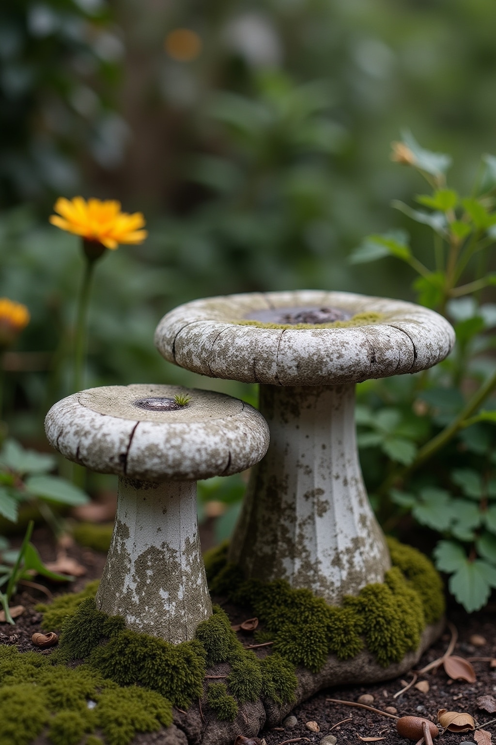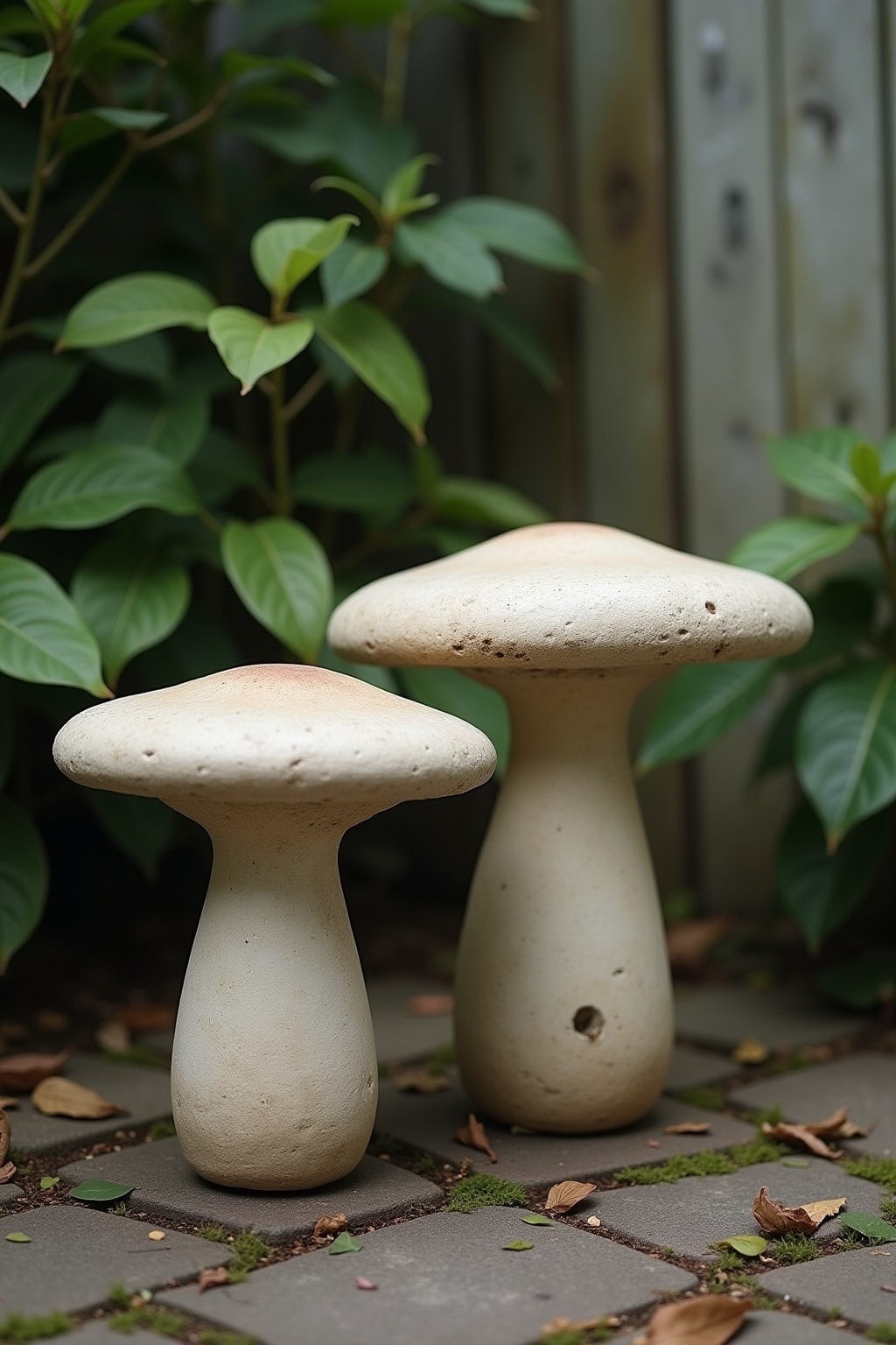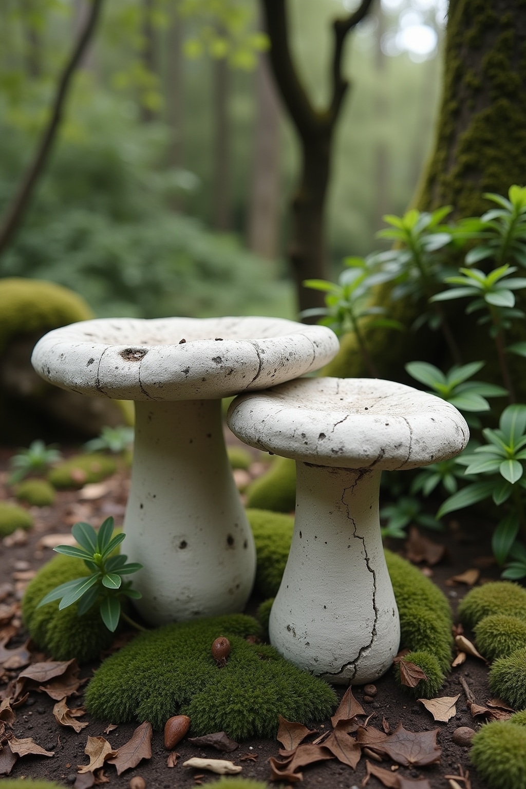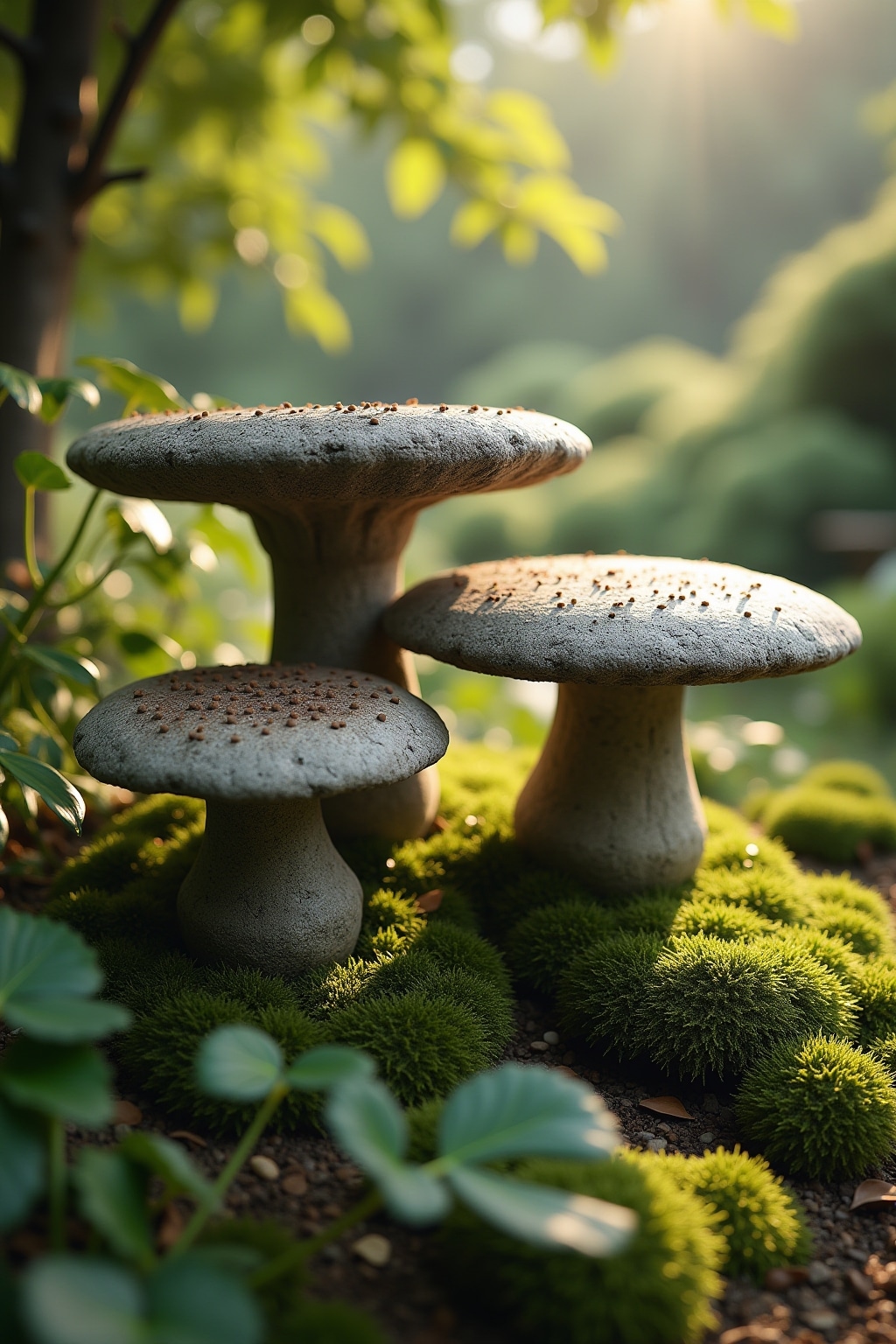 Vintage Beton Pilze als funktionale Hocker und Blickfang im naturnahen Garten
