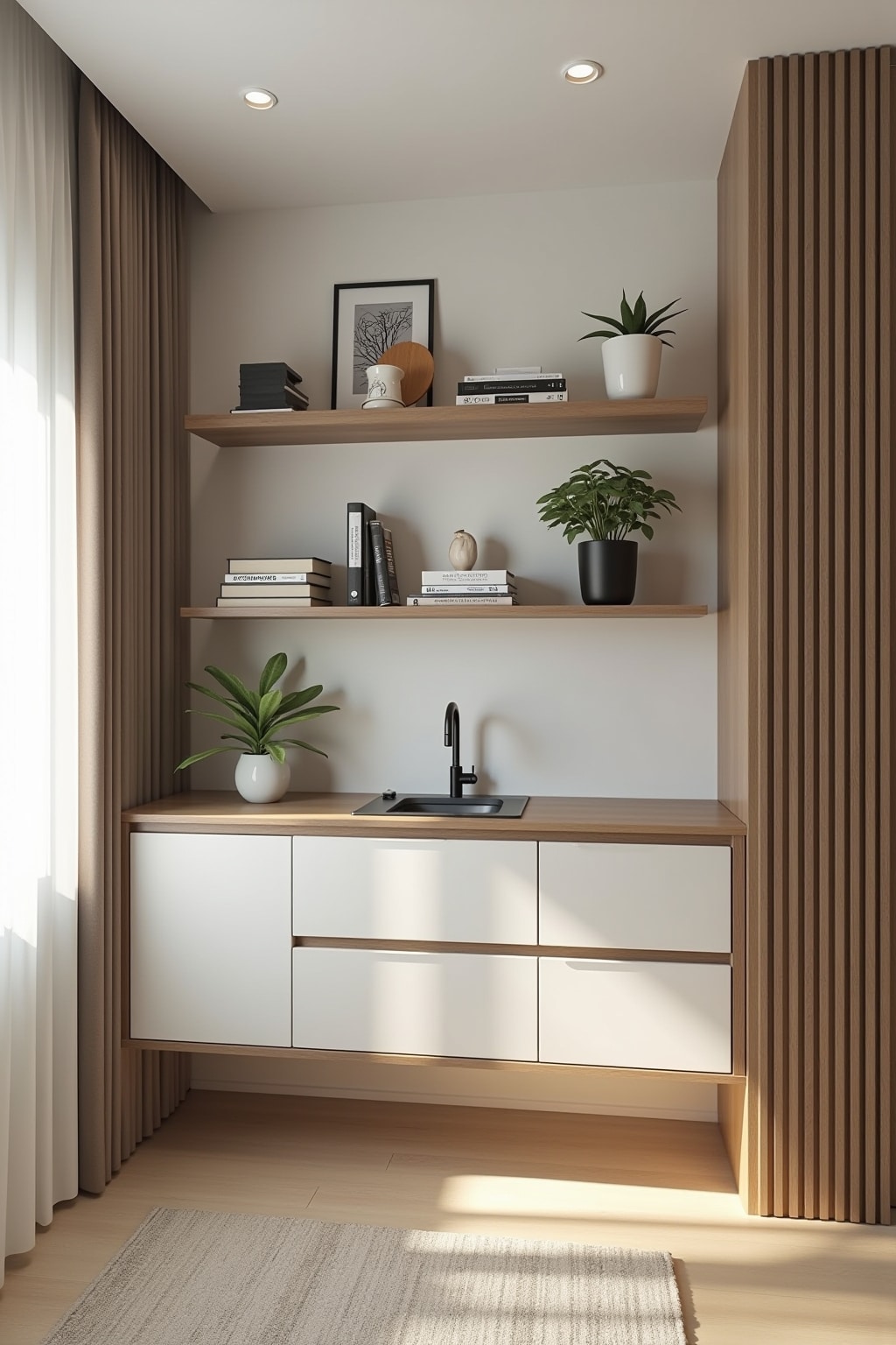 6. Vertikale Akzente durch schmale Wandpaneele in Naturmaterialien