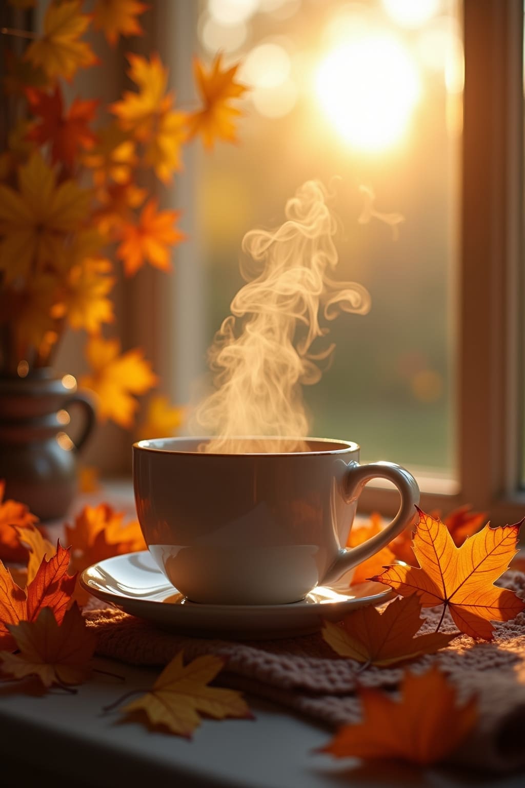 3. Herbst: „Nebel und bunte Blätter – der perfekte Herbstmorgen für eine heiße Tasse Tee und neue Abenteuer.“