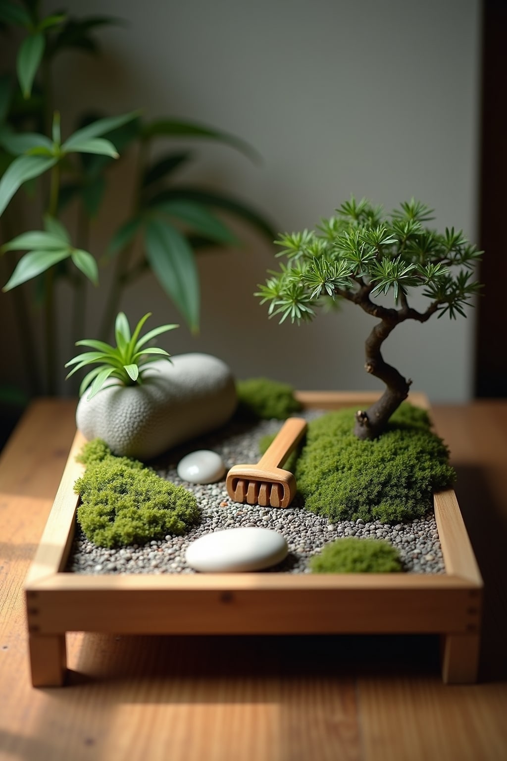 – Verwende ein klares, niedriges Podest aus Holz, um deinen Mini-Zen-Garten auf Augenhöhe zu bringen
