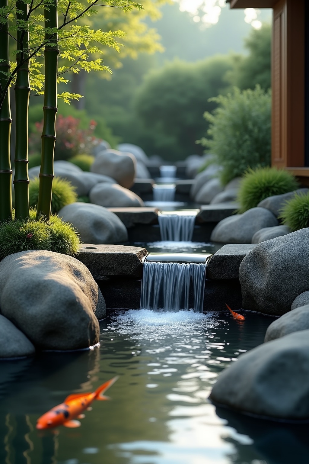 4. Miniatur-Wasserfälle für beruhigendes Plätschern integrieren